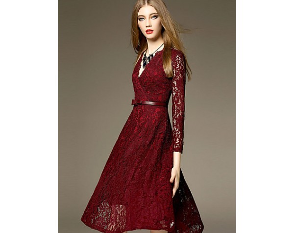 Women's Party/Cocktail Sexy Sheath Dress,Patchwork V Neck Maxi Long Sleeve Red Cotton Summer