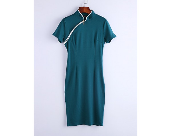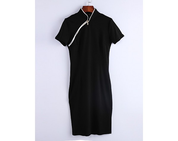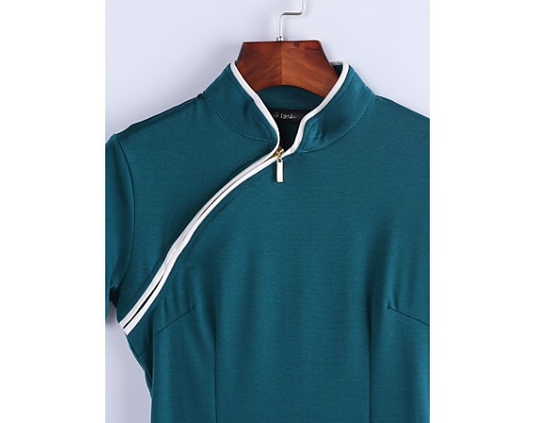 Work Bodycon Dress,Solid Stand Knee-length Short Sleeve Red / Black / Green Cotton / Others Summer Stretchy