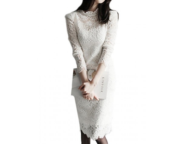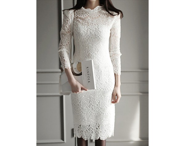 Women's Going out / Work Sophisticated Sheath / Lace / Black and White Dress,Solid Stand Knee-length Long Sleeve White / BlackCotton /