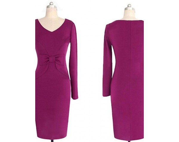 Women's Vintage Blue/Gray/Purple V Neck Midi Dress, Cotton Blends Knee-length Long Sleeve
