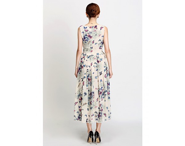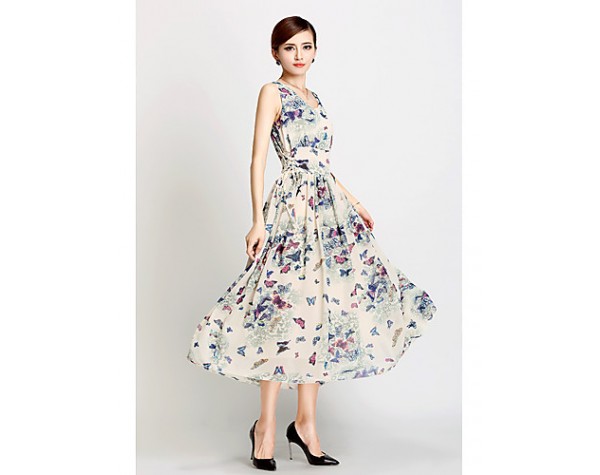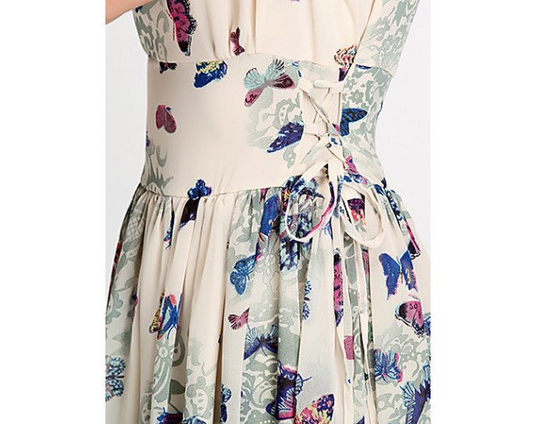 Women's Butterfly Print Beige Dress, Vintage/Print/Maxi U Neck Sleeveless Swing