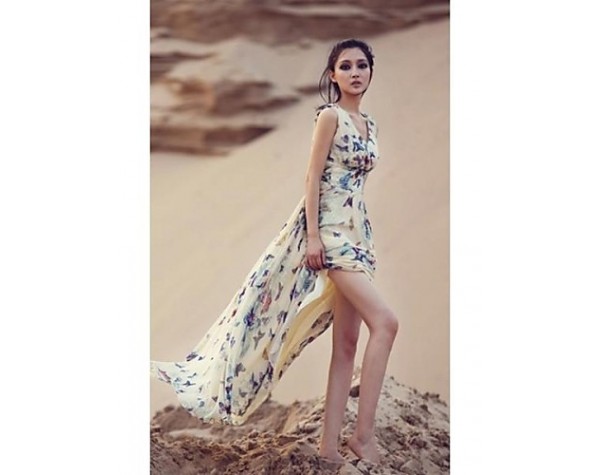 Product Code: Women's Butterfly Print Beige Dress, Vintage/Print/Maxi U Neck S