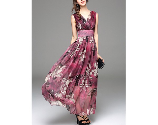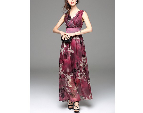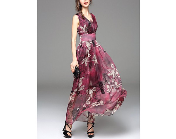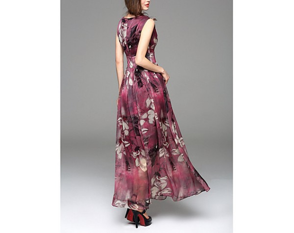 Going out Simple Sheath Dress,Print V Neck Maxi Sleeveless Blue / Red Polyester Summer Mid Rise