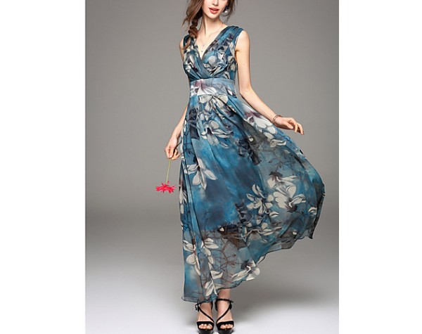 Product Code: Going out Simple Sheath Dress,Print V Neck Maxi Sleeveless Blue