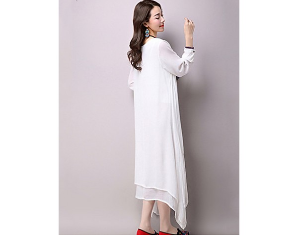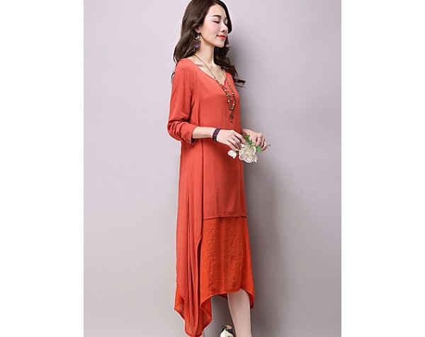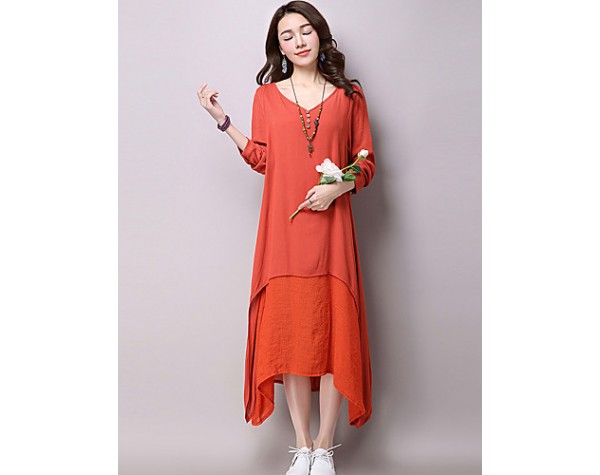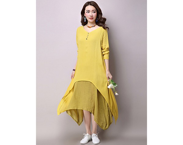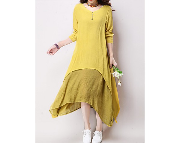 Women's Casual / Day Solid Loose / Swing Dress ,False Two Literature and ArtV Neck Maxi Cotton / Linen